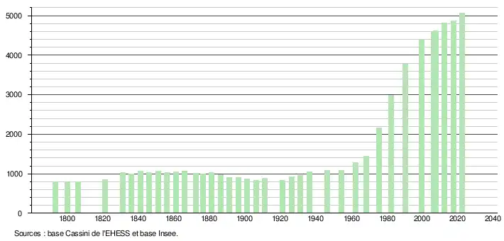 L'évolution du nombre d'habitants est connue à travers les recensements de la population effectués dans la commune depuis 1793. Pour les communes de moins de 10 000 habitants, une enquête de recensement portant sur toute la population est réalisée tous les cinq ans, les populations de référence des années intermédiaires étant quant à elles estimées par interpolation ou extrapolation[18]. Pour la commune, le premier recensement exhaustif entrant dans le cadre du nouveau dispositif a été réalisé en 2007[19].