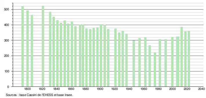 L'évolution du nombre d'habitants est connue à travers les recensements de la population effectués dans la commune depuis 1793. Pour les communes de moins de 10 000 habitants, une enquête de recensement portant sur toute la population est réalisée tous les cinq ans, les populations de référence des années intermédiaires étant quant à elles estimées par interpolation ou extrapolation[18]. Pour la commune, le premier recensement exhaustif entrant dans le cadre du nouveau dispositif a été réalisé en 2007[19].