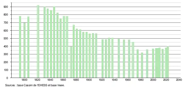 L'évolution du nombre d'habitants est connue à travers les recensements de la population effectués dans la commune depuis 1793. Pour les communes de moins de 10 000 habitants, une enquête de recensement portant sur toute la population est réalisée tous les cinq ans, les populations de référence des années intermédiaires étant quant à elles estimées par interpolation ou extrapolation[22]. Pour la commune, le premier recensement exhaustif entrant dans le cadre du nouveau dispositif a été réalisé en 2004[23].