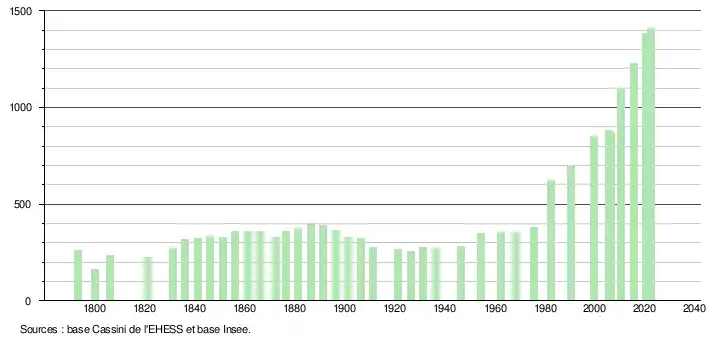 L'évolution du nombre d'habitants est connue à travers les recensements de la population effectués dans la commune depuis 1793. Pour les communes de moins de 10 000 habitants, une enquête de recensement portant sur toute la population est réalisée tous les cinq ans, les populations de référence des années intermédiaires étant quant à elles estimées par interpolation ou extrapolation[19]. Pour la commune, le premier recensement exhaustif entrant dans le cadre du nouveau dispositif a été réalisé en 2005[20].