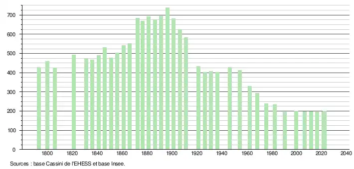 L'évolution du nombre d'habitants est connue à travers les recensements de la population effectués dans la commune depuis 1793. Pour les communes de moins de 10 000 habitants, une enquête de recensement portant sur toute la population est réalisée tous les cinq ans, les populations de référence des années intermédiaires étant quant à elles estimées par interpolation ou extrapolation[18]. Pour la commune, le premier recensement exhaustif entrant dans le cadre du nouveau dispositif a été réalisé en 2006[19].