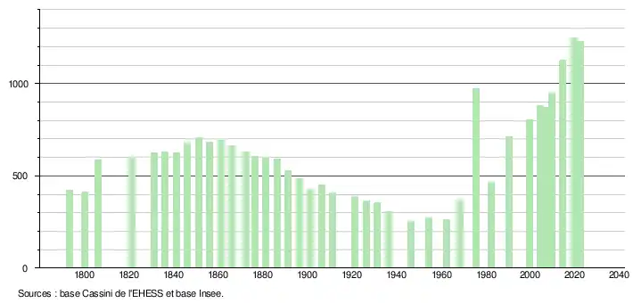 L'évolution du nombre d'habitants est connue à travers les recensements de la population effectués dans la commune depuis 1793. Pour les communes de moins de 10 000 habitants, une enquête de recensement portant sur toute la population est réalisée tous les cinq ans, les populations de référence des années intermédiaires étant quant à elles estimées par interpolation ou extrapolation[16]. Pour la commune, le premier recensement exhaustif entrant dans le cadre du nouveau dispositif a été réalisé en 2004[17].