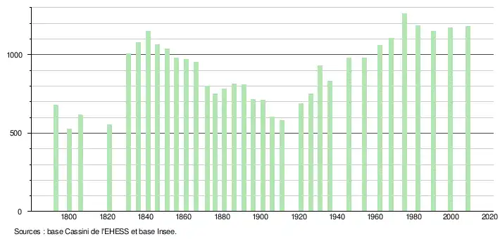 L'évolution du nombre d'habitants est connue à travers les recensements de la population effectués dans la commune depuis 1793. À partir du , les populations légales des communes sont publiées annuellement dans le cadre d'un recensement qui repose désormais sur une collecte d'information annuelle, concernant successivement tous les territoires communaux au cours d'une période de cinq ans. Pour les communes de moins de 10 000 habitants, une enquête de recensement portant sur toute la population est réalisée tous les cinq ans, les populations légales des années intermédiaires étant quant à elles estimées par interpolation ou extrapolation[13]. Pour la commune, le premier recensement exhaustif entrant dans le cadre du nouveau dispositif a été réalisé en 2008[14],[Note 1].