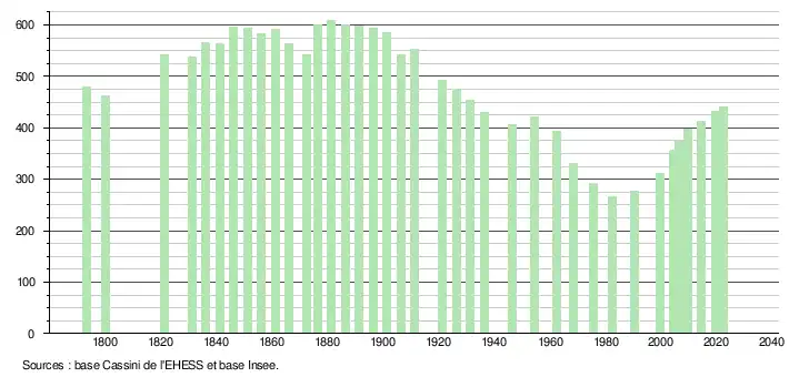 L'évolution du nombre d'habitants est connue à travers les recensements de la population effectués dans la commune depuis 1793. Pour les communes de moins de 10 000 habitants, une enquête de recensement portant sur toute la population est réalisée tous les cinq ans, les populations de référence des années intermédiaires étant quant à elles estimées par interpolation ou extrapolation[25]. Pour la commune, le premier recensement exhaustif entrant dans le cadre du nouveau dispositif a été réalisé en 2004[26].