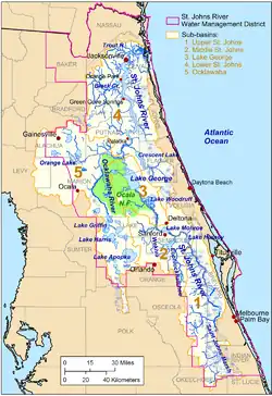 Sur 60 kilomètres, le fleuve passe à travers un bassin de 3 100 kilomètres carrés principalement alimenté par des sources et le ruissellement des eaux pluviales. Ce bassin, couvrant une partie des comtés d'Orange, de Lake, de Volusia et de Seminole, est le foyer de la grande région métropolitaine d'Orlando où deux millions de personnes résident et où de nombreuses attractions touristiques sont situées[21]. La topographie du bassin moyen varie entre des rives clairement distinguables le long du lit du fleuve et de vastes lacs peu profonds. Deux des plus grands lacs de ce bassin sont créés par le cours d'eau : le lac Harney (en) et le lac Monroe (en). Peu profond, le lac Harney, d'une superficie de 23 kilomètres carrés, est alimenté par le long et étroit lac Puzzle (en), immédiatement au nord de la rivière Econlockhatchee, laquelle rejoint le Saint Johns et y augmente son volume d'eau ce qui permet une meilleure navigation des bateaux. Le fleuve vire à l'ouest, touchant le lac Jesup (en) avant de se jeter dans le lac Monroe, en passant de la ville de Sanford. Le lac Monroe est un grand lac de 39 kilomètres carrés avec une profondeur moyenne de 2,4 mètres, drainant un bassin de 6 300 kilomètres carrés[22]. Sanford s'est adapté au lac en construisant une partie de son centre-ville sur le front du lac, ce qui fait qu'une partie des transports publics dans la ville peuvent se faire par bateau[23].