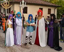 Cosplay de plusieurs personnages jouables, de gauche à droite : le chevalier d'Or Aphrodite des Poissons et le chevalier d'Or Shion du Bélier, sous leur forme spectrale, et le chevalier d'Or du Taureau, Aldébaran. | ||