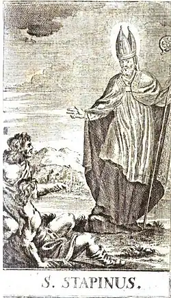 Stapin était généralement montré en évêque, parfois avec les pieds liés, rappelant ses interventions possibles en faveur des personnes souffrant des membres inférieurs : boiteux, infirmes ou malades de la goutte.