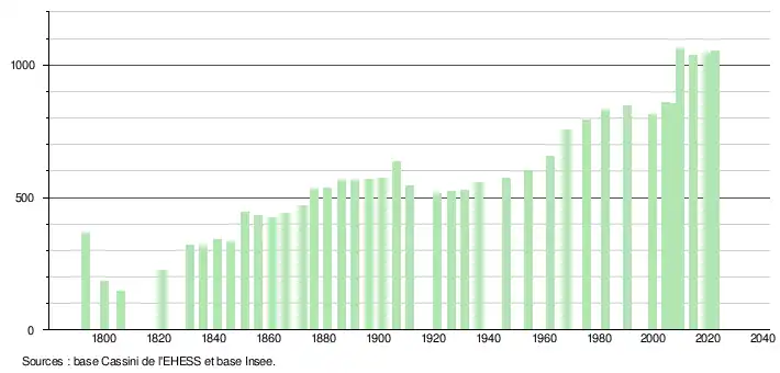L'évolution du nombre d'habitants est connue à travers les recensements de la population effectués dans la commune depuis 1793. Pour les communes de moins de 10 000 habitants, une enquête de recensement portant sur toute la population est réalisée tous les cinq ans, les populations de référence des années intermédiaires étant quant à elles estimées par interpolation ou extrapolation[17]. Pour la commune, le premier recensement exhaustif entrant dans le cadre du nouveau dispositif a été réalisé en 2004[18].