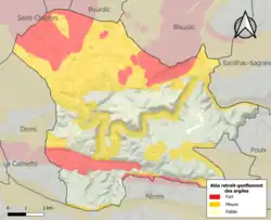 Le retrait-gonflement des sols argileux est susceptible d'engendrer des dommages importants aux bâtiments en cas d’alternance de périodes de sécheresse et de pluie. 57,1 % de la superficie communale est en aléa moyen ou fort (67,5 % au niveau départemental et 48,5 % au niveau national). Sur les 772 bâtiments dénombrés sur la commune en 2019, 593 sont en aléa moyen ou fort, soit 77 %, à comparer aux 90 % au niveau départemental et 54 % au niveau national. Une cartographie de l'exposition du territoire national au retrait gonflement des sols argileux est disponible sur le site du BRGM[28],[Carte 2].