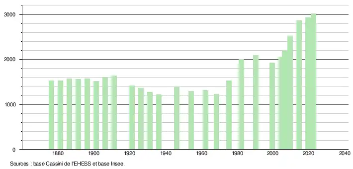 L'évolution du nombre d'habitants est connue à travers les recensements de la population effectués dans la commune depuis 1876. Pour les communes de moins de 10 000 habitants, une enquête de recensement portant sur toute la population est réalisée tous les cinq ans, les populations de référence des années intermédiaires étant quant à elles estimées par interpolation ou extrapolation[19]. Pour la commune, le premier recensement exhaustif entrant dans le cadre du nouveau dispositif a été réalisé en 2004[20].