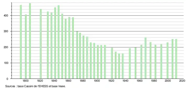 L'évolution du nombre d'habitants est connue à travers les recensements de la population effectués dans la commune depuis 1793. À partir du , les populations légales des communes sont publiées annuellement dans le cadre d'un recensement qui repose désormais sur une collecte d'information annuelle, concernant successivement tous les territoires communaux au cours d'une période de cinq ans. Pour les communes de moins de 10 000 habitants, une enquête de recensement portant sur toute la population est réalisée tous les cinq ans, les populations légales des années intermédiaires étant quant à elles estimées par interpolation ou extrapolation[4]. Pour la commune, le premier recensement exhaustif entrant dans le cadre du nouveau dispositif a été réalisé en 2006[5],[Note 1].