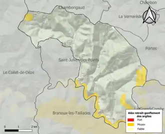 La commune est vulnérable au risque de mouvements de terrains constitué principalement du retrait-gonflement des sols argileux[22]. Cet aléa est susceptible d'engendrer des dommages importants aux bâtiments en cas d’alternance de périodes de sécheresse et de pluie. 8,7 % de la superficie communale est en aléa moyen ou fort (67,5 % au niveau départemental et 48,5 % au niveau national). Sur les 297 bâtiments dénombrés sur la commune en 2019, 45 sont en aléa moyen ou fort, soit 15 %, à comparer aux 90 % au niveau départemental et 54 % au niveau national. Une cartographie de l'exposition du territoire national au retrait gonflement des sols argileux est disponible sur le site du BRGM[23],[Carte 2].