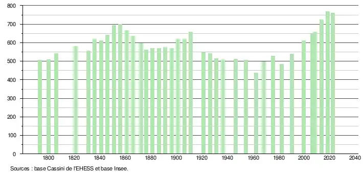- ↑ Population municipale de référence en vigueur au 1er janvier 2025, millésimée 2022, définie dans les limites territoriales en vigueur au 1er janvier 2024, date de référence statistique : 1er janvier 2022.