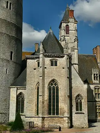 La Sainte-Chapelle de Châteaudun a été élevée en trois campagnes. Dunois obtient en 1451 de l'évêque de Chartres l'autorisation de démolir la vieille chapelle du château. La chapelle a deux niveaux, comme on en trouve dans plusieurs demeures princières, mais, contrairement à l'usage, c'est la chapelle basse qui est la chapelle seigneuriale, la chapelle haute étant à l'usage des serviteurs[1]. Elle est dédiée à la Vierge et à saint Jean-Baptiste, patrons de l'épouse et de Dunois. La chapelle haute était réservée aux domestiques et était dite de saint Vincent.