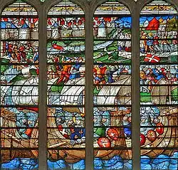 - au niveau intermédiaire, des épisodes de la vie de saint Louis. D'après Eugène Pépin, repris par Marcel Aubert, Alain Erlande-Brandenburg et Louis Grodecki, ces scènes ont été inspirées par les miniatures du Livre des faiz de Monseigneur Saint Louis[2] datant d'environ 1480,