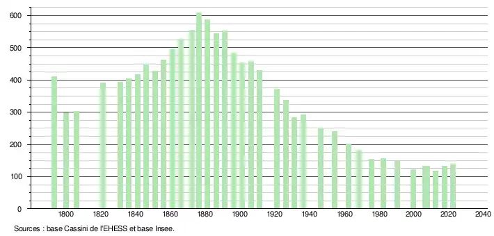 L'évolution du nombre d'habitants est connue à travers les recensements de la population effectués dans la commune depuis 1793. Pour les communes de moins de 10 000 habitants, une enquête de recensement portant sur toute la population est réalisée tous les cinq ans, les populations de référence des années intermédiaires étant quant à elles estimées par interpolation ou extrapolation[28]. Pour la commune, le premier recensement exhaustif entrant dans le cadre du nouveau dispositif a été réalisé en 2007[29].