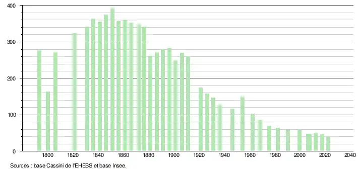 L'évolution du nombre d'habitants est connue à travers les recensements de la population effectués dans la commune depuis 1793. Pour les communes de moins de 10 000 habitants, une enquête de recensement portant sur toute la population est réalisée tous les cinq ans, les populations de référence des années intermédiaires étant quant à elles estimées par interpolation ou extrapolation[39]. Pour la commune, le premier recensement exhaustif entrant dans le cadre du nouveau dispositif a été réalisé en 2007[40].