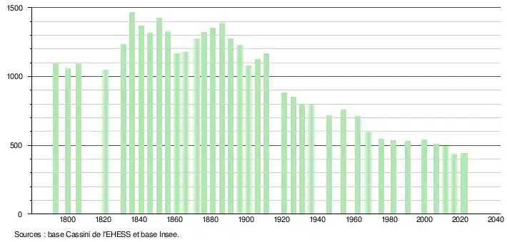 L'évolution du nombre d'habitants est connue à travers les recensements de la population effectués dans la commune depuis 1793. Pour les communes de moins de 10 000 habitants, une enquête de recensement portant sur toute la population est réalisée tous les cinq ans, les populations de référence des années intermédiaires étant quant à elles estimées par interpolation ou extrapolation[30]. Pour la commune, le premier recensement exhaustif entrant dans le cadre du nouveau dispositif a été réalisé en 2006[31].