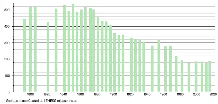 L'évolution du nombre d'habitants est connue à travers les recensements de la population effectués dans la commune depuis 1793. Pour les communes de moins de 10 000 habitants, une enquête de recensement portant sur toute la population est réalisée tous les cinq ans, les populations de référence des années intermédiaires étant quant à elles estimées par interpolation ou extrapolation[17]. Pour la commune, le premier recensement exhaustif entrant dans le cadre du nouveau dispositif a été réalisé en 2006[18].
