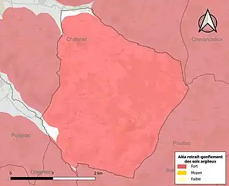 Le retrait-gonflement des sols argileux est susceptible d'engendrer des dommages importants aux bâtiments en cas d’alternance de périodes de sécheresse et de pluie. 97,8 % de la superficie communale est en aléa moyen ou fort (54,2 % au niveau départemental et 48,5 % au niveau national). Sur les 60 bâtiments dénombrés sur la commune en 2019, 60 sont en aléa moyen ou fort, soit 100 %, à comparer aux 57 % au niveau départemental et 54 % au niveau national. Une cartographie de l'exposition du territoire national au retrait gonflement des sols argileux est disponible sur le site du BRGM[10],[Carte 2].