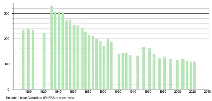 L'évolution du nombre d'habitants est connue à travers les recensements de la population effectués dans la commune depuis 1793. Pour les communes de moins de 10 000 habitants, une enquête de recensement portant sur toute la population est réalisée tous les cinq ans, les populations de référence des années intermédiaires étant quant à elles estimées par interpolation ou extrapolation[17]. Pour la commune, le premier recensement exhaustif entrant dans le cadre du nouveau dispositif a été réalisé en 2007[18].
