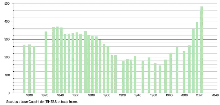 L'évolution du nombre d'habitants est connue à travers les recensements de la population effectués dans la commune depuis 1793. Pour les communes de moins de 10 000 habitants, une enquête de recensement portant sur toute la population est réalisée tous les cinq ans, les populations de référence des années intermédiaires étant quant à elles estimées par interpolation ou extrapolation[15]. Pour la commune, le premier recensement exhaustif entrant dans le cadre du nouveau dispositif a été réalisé en 2006[16].