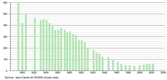 L'évolution du nombre d'habitants est connue à travers les recensements de la population effectués dans la commune depuis 1793. Pour les communes de moins de 10 000 habitants, une enquête de recensement portant sur toute la population est réalisée tous les cinq ans, les populations de référence des années intermédiaires étant quant à elles estimées par interpolation ou extrapolation[17]. Pour la commune, le premier recensement exhaustif entrant dans le cadre du nouveau dispositif a été réalisé en 2006[18].