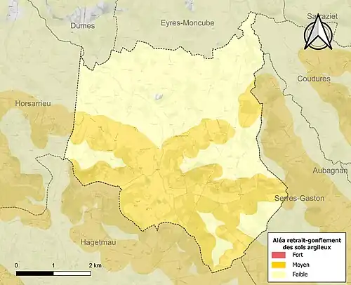 Le retrait-gonflement des sols argileux est susceptible d'engendrer des dommages importants aux bâtiments en cas d’alternance de périodes de sécheresse et de pluie. 46,5 % de la superficie communale est en aléa moyen ou fort (19,2 % au niveau départemental et 48,5 % au niveau national). Sur les 288 bâtiments dénombrés sur la commune en 2019, 99 sont en aléa moyen ou fort, soit 34 %, à comparer aux 17 % au niveau départemental et 54 % au niveau national. Une cartographie de l'exposition du territoire national au retrait gonflement des sols argileux est disponible sur le site du BRGM[18],[Carte 2].