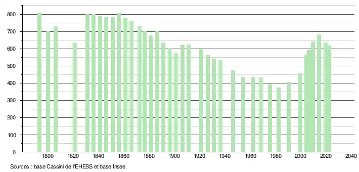 L'évolution du nombre d'habitants est connue à travers les recensements de la population effectués dans la commune depuis 1793. Pour les communes de moins de 10 000 habitants, une enquête de recensement portant sur toute la population est réalisée tous les cinq ans, les populations de référence des années intermédiaires étant quant à elles estimées par interpolation ou extrapolation[21]. Pour la commune, le premier recensement exhaustif entrant dans le cadre du nouveau dispositif a été réalisé en 2004[22].