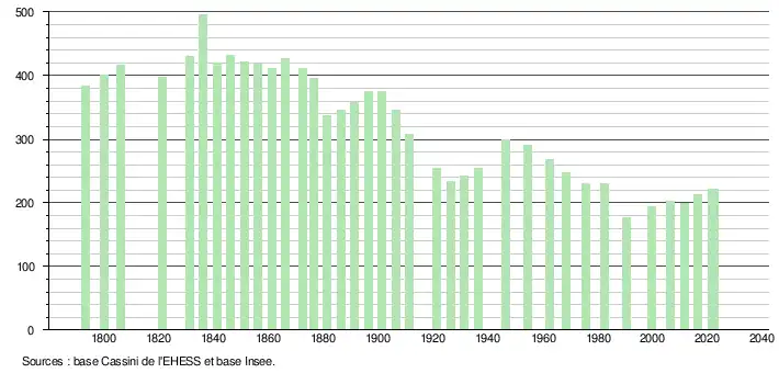 L'évolution du nombre d'habitants est connue à travers les recensements de la population effectués dans la commune depuis 1793. Pour les communes de moins de 10 000 habitants, une enquête de recensement portant sur toute la population est réalisée tous les cinq ans, les populations de référence des années intermédiaires étant quant à elles estimées par interpolation ou extrapolation[18]. Pour la commune, le premier recensement exhaustif entrant dans le cadre du nouveau dispositif a été réalisé en 2006[19].