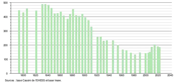 - ↑ Population municipale de référence en vigueur au 1er janvier 2025, millésimée 2022, définie dans les limites territoriales en vigueur au 1er janvier 2024, date de référence statistique : 1er janvier 2022.
