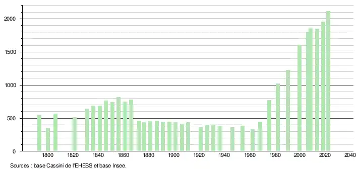 L'évolution du nombre d'habitants est connue à travers les recensements de la population effectués dans la commune depuis 1793. Pour les communes de moins de 10 000 habitants, une enquête de recensement portant sur toute la population est réalisée tous les cinq ans, les populations de référence des années intermédiaires étant quant à elles estimées par interpolation ou extrapolation[36]. Pour la commune, le premier recensement exhaustif entrant dans le cadre du nouveau dispositif a été réalisé en 2008[37].