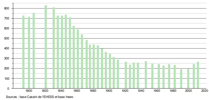 - ↑ Par convention dans Wikipédia, le principe a été retenu de n’afficher dans le tableau des recensements et le graphique, pour les populations légales postérieures à 1999, que les populations correspondant à une enquête exhaustive de recensement pour les communes de moins de 10 000 habitants, et que les populations des années 2006, 2011, 2016, etc. pour les communes de plus de 10 000 habitants, ainsi que la dernière population légale publiée par l’Insee pour l'ensemble des communes.