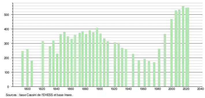 L'évolution du nombre d'habitants est connue à travers les recensements de la population effectués dans la commune depuis 1793. Pour les communes de moins de 10 000 habitants, une enquête de recensement portant sur toute la population est réalisée tous les cinq ans, les populations de référence des années intermédiaires étant quant à elles estimées par interpolation ou extrapolation[14]. Pour la commune, le premier recensement exhaustif entrant dans le cadre du nouveau dispositif a été réalisé en 2005[15].