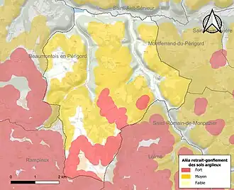Les mouvements de terrains susceptibles de se produire sur la commune sont des tassements différentiels[39]. Le retrait-gonflement des sols argileux est susceptible d'engendrer des dommages importants aux bâtiments en cas d’alternance de périodes de sécheresse et de pluie[40]. 70,3 % de la superficie communale est en aléa moyen ou fort (58,6 % au niveau départemental et 48,5 % au niveau national métropolitain)[Carte 4]. Depuis le , en application de la loi ÉLAN, différentes contraintes s'imposent aux vendeurs, maîtres d'ouvrages ou constructeurs de biens situés dans une zone classée en aléa moyen ou fort[Note 3],[41].