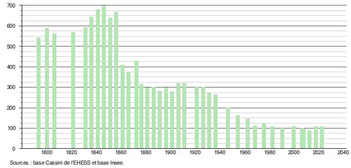 L'évolution du nombre d'habitants est connue à travers les recensements de la population effectués dans la commune depuis 1793. Pour les communes de moins de 10 000 habitants, une enquête de recensement portant sur toute la population est réalisée tous les cinq ans, les populations de référence des années intermédiaires étant quant à elles estimées par interpolation ou extrapolation[17]. Pour la commune, le premier recensement exhaustif entrant dans le cadre du nouveau dispositif a été réalisé en 2007[18].