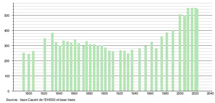 L'évolution du nombre d'habitants est connue à travers les recensements de la population effectués dans la commune depuis 1793. Pour les communes de moins de 10 000 habitants, une enquête de recensement portant sur toute la population est réalisée tous les cinq ans, les populations de référence des années intermédiaires étant quant à elles estimées par interpolation ou extrapolation[20]. Pour la commune, le premier recensement exhaustif entrant dans le cadre du nouveau dispositif a été réalisé en 2005[21].