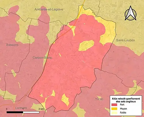 Le retrait-gonflement des sols argileux est susceptible d'engendrer des dommages importants aux bâtiments en cas d’alternance de périodes de sécheresse et de pluie. La totalité de la commune est en aléa moyen ou fort (67,4 % au niveau départemental et 48,5 % au niveau national). Sur les 1 823 bâtiments dénombrés sur la commune en 2019, 1 823 sont en aléa moyen ou fort, soit 100 %, à comparer aux 84 % au niveau départemental et 54 % au niveau national. Une cartographie de l'exposition du territoire national au retrait gonflement des sols argileux est disponible sur le site du BRGM[20],[Carte 2].