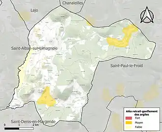 Le retrait-gonflement des sols argileux est susceptible d'engendrer des dommages importants aux bâtiments en cas d’alternance de périodes de sécheresse et de pluie. 5,8 % de la superficie communale est en aléa moyen ou fort (15,8 % au niveau départemental et 48,5 % au niveau national). Sur les 59 bâtiments dénombrés sur la commune en 2019, 1 sont en aléa moyen ou fort, soit 2 %, à comparer aux 14 % au niveau départemental et 54 % au niveau national. Une cartographie de l'exposition du territoire national au retrait gonflement des sols argileux est disponible sur le site du BRGM[21],[Carte 2].