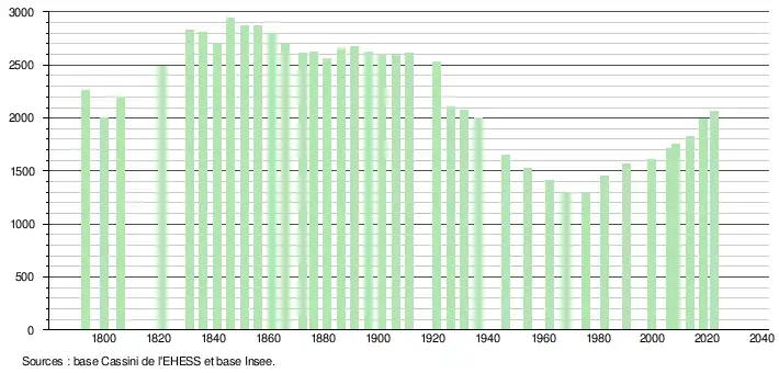 L'évolution du nombre d'habitants est connue à travers les recensements de la population effectués dans la commune depuis 1793. Pour les communes de moins de 10 000 habitants, une enquête de recensement portant sur toute la population est réalisée tous les cinq ans, les populations de référence des années intermédiaires étant quant à elles estimées par interpolation ou extrapolation[27]. Pour la commune, le premier recensement exhaustif entrant dans le cadre du nouveau dispositif a été réalisé en 2008[28].
