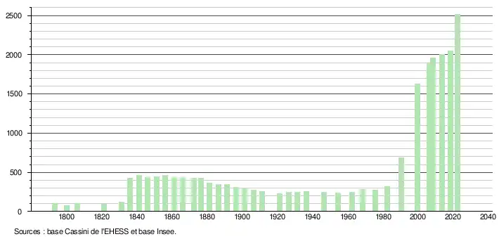 L'évolution du nombre d'habitants est connue à travers les recensements de la population effectués dans la commune depuis 1793. Pour les communes de moins de 10 000 habitants, une enquête de recensement portant sur toute la population est réalisée tous les cinq ans, les populations de référence des années intermédiaires étant quant à elles estimées par interpolation ou extrapolation[29]. Pour la commune, le premier recensement exhaustif entrant dans le cadre du nouveau dispositif a été réalisé en 2008[30].