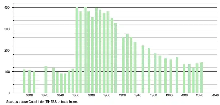 L'évolution du nombre d'habitants est connue à travers les recensements de la population effectués dans la commune depuis 1793. Pour les communes de moins de 10 000 habitants, une enquête de recensement portant sur toute la population est réalisée tous les cinq ans, les populations de référence des années intermédiaires étant quant à elles estimées par interpolation ou extrapolation[20]. Pour la commune, le premier recensement exhaustif entrant dans le cadre du nouveau dispositif a été réalisé en 2006[21].