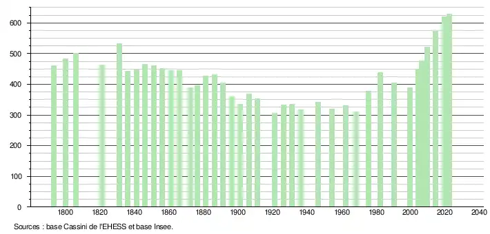 L'évolution du nombre d'habitants est connue à travers les recensements de la population effectués dans la commune depuis 1793. Pour les communes de moins de 10 000 habitants, une enquête de recensement portant sur toute la population est réalisée tous les cinq ans, les populations de référence des années intermédiaires étant quant à elles estimées par interpolation ou extrapolation[18]. Pour la commune, le premier recensement exhaustif entrant dans le cadre du nouveau dispositif a été réalisé en 2004[19].