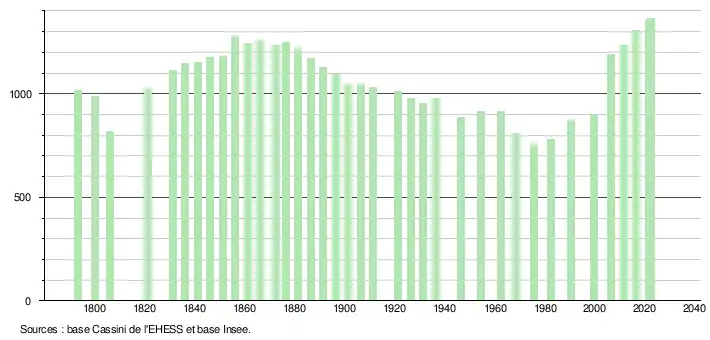 L'évolution du nombre d'habitants est connue à travers les recensements de la population effectués dans la commune depuis 1793. Pour les communes de moins de 10 000 habitants, une enquête de recensement portant sur toute la population est réalisée tous les cinq ans, les populations de référence des années intermédiaires étant quant à elles estimées par interpolation ou extrapolation[16]. Pour la commune, le premier recensement exhaustif entrant dans le cadre du nouveau dispositif a été réalisé en 2006[17].