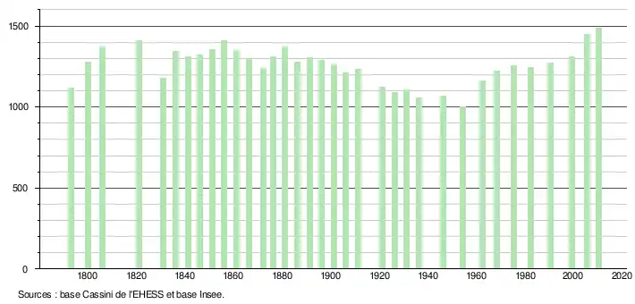 L'évolution du nombre d'habitants est connue à travers les recensements de la population effectués dans la commune depuis 1793. À partir du , les populations légales des communes sont publiées annuellement dans le cadre d'un recensement qui repose désormais sur une collecte d'information annuelle, concernant successivement tous les territoires communaux au cours d'une période de cinq ans. Pour les communes de moins de 10 000 habitants, une enquête de recensement portant sur toute la population est réalisée tous les cinq ans, les populations légales des années intermédiaires étant quant à elles estimées par interpolation ou extrapolation[12]. Pour la commune, le premier recensement exhaustif entrant dans le cadre du nouveau dispositif a été réalisé en 2005[13],[Note 1].