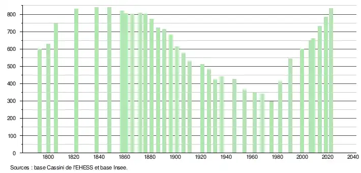 L'évolution du nombre d'habitants est connue à travers les recensements de la population effectués dans la commune depuis 1793. Pour les communes de moins de 10 000 habitants, une enquête de recensement portant sur toute la population est réalisée tous les cinq ans, les populations de référence des années intermédiaires étant quant à elles estimées par interpolation ou extrapolation[9]. Pour la commune, le premier recensement exhaustif entrant dans le cadre du nouveau dispositif a été réalisé en 2008[10].