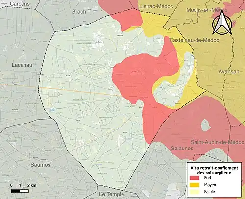 Le retrait-gonflement des sols argileux est susceptible d'engendrer des dommages importants aux bâtiments en cas d’alternance de périodes de sécheresse et de pluie. 27,9% de la superficie communale est en aléa moyen ou fort (67,4% au niveau départemental et 48,5% au niveau national). Sur les 1 085 bâtiments dénombrés sur la commune en 2019, 862 sont en aléa moyen ou fort, soit 79%, à comparer aux 84% au niveau départemental et 54% au niveau national. Une cartographie de l'exposition du territoire national au retrait gonflement des sols argileux est disponible sur le site du BRGM[25],[Carte 2].