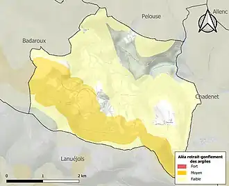 Le retrait-gonflement des sols argileux est susceptible d'engendrer des dommages importants aux bâtiments en cas d’alternance de périodes de sécheresse et de pluie. 30,7 % de la superficie communale est en aléa moyen ou fort (15,8 % au niveau départemental et 48,5 % au niveau national). Sur les 57 bâtiments dénombrés sur la commune en 2019, aucun n'est en aléa moyen ou fort, à comparer aux 14 % au niveau départemental et 54 % au niveau national. Une cartographie de l'exposition du territoire national au retrait gonflement des sols argileux est disponible sur le site du BRGM[25],[Carte 2].
