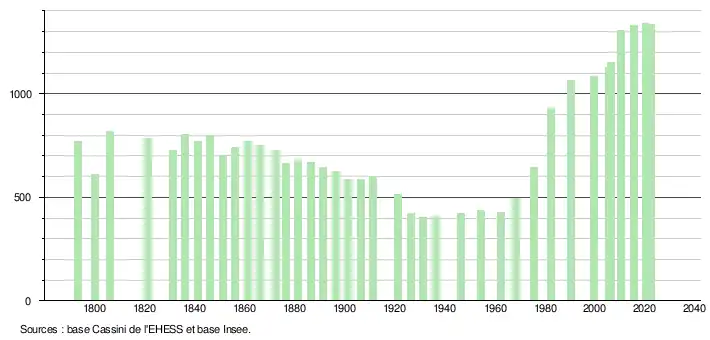 L'évolution du nombre d'habitants est connue à travers les recensements de la population effectués dans la commune depuis 1793. Pour les communes de moins de 10 000 habitants, une enquête de recensement portant sur toute la population est réalisée tous les cinq ans, les populations de référence des années intermédiaires étant quant à elles estimées par interpolation ou extrapolation[29]. Pour la commune, le premier recensement exhaustif entrant dans le cadre du nouveau dispositif a été réalisé en 2005[30].