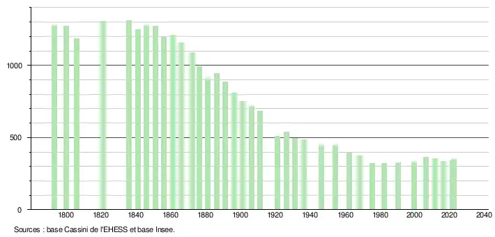 L'évolution du nombre d'habitants est connue à travers les recensements de la population effectués dans la commune depuis 1793. Pour les communes de moins de 10 000 habitants, une enquête de recensement portant sur toute la population est réalisée tous les cinq ans, les populations de référence des années intermédiaires étant quant à elles estimées par interpolation ou extrapolation[31]. Pour la commune, le premier recensement exhaustif entrant dans le cadre du nouveau dispositif a été réalisé en 2006[32].